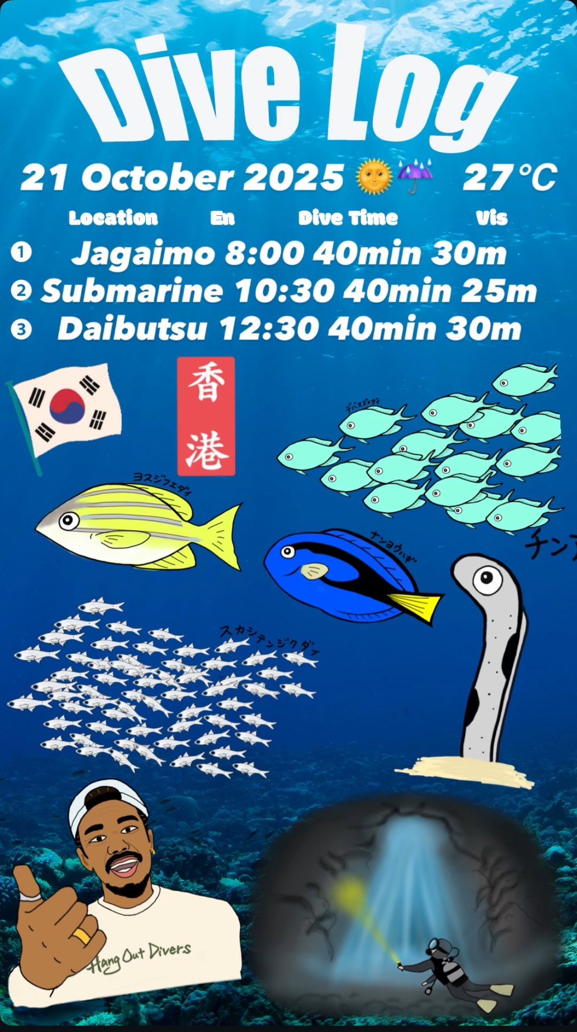 HangOut Divers 다이버 분들의 아지트와 같은 @hangout_divers에서 만난 모든 분들이 함께 다이빙을 즐길 수 있는 다이빙 숍을 목표로 하고 있습니다. 다이빙, 만남, 이치고이치에(いちごいちえ, 사람의 만남을 소중히 하라라는 일본 속담) 를 소중하게 생각하는 마음을 담아 매 다이빙 투어를 소규모인원수로 운영하고 있습니다.